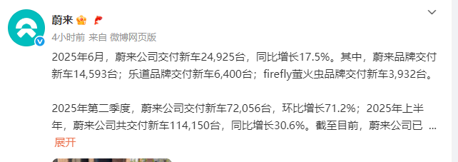蔚来发布数据显示,2025年6月,蔚来公司交付新车24925辆,同比增长17.5%。其中,蔚来品牌交付新车14593辆;乐道品牌交付新车6400辆;firefly萤火虫品牌交付新车3932辆。2025年第二季度,蔚来公司交付新车72056辆,环比增长71.2%;2025年上半年,蔚来公司共交付新车11.4万辆,同比增长30.6%。截至目前,蔚来公司已累计交付新车78.6万辆。