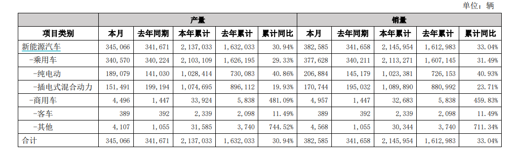比亚迪(002594)发布的数据显示,6月汽车销量38.25万辆,去年同期为34.17万辆;本年累计销量为214.6万辆,去年同期为161.3万辆,同比增加33.04%。