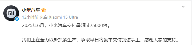 不过,6月26日,小米首款SUV车型YU7正式发布上市,起售价25.35万元,该款车型上市即取得亮眼“战报”,成为又一“现象级”产品。小米汽车官微称,3分钟,小米YU7大定突破20万台。1小时,大定突破28.9万台。开售18小时,小米YU7锁单量突破24万台。目前,小米YU7标准版锁单后交付日期已排至57周以后,小米汽车表示,正在全力以赴抓紧生产,争取早日交付。