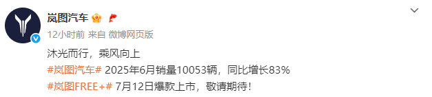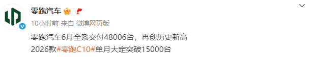 此外,零跑汽车6月全系交付48006辆,再创历史新高;岚图汽车6月销量10053辆,同比增长83%。