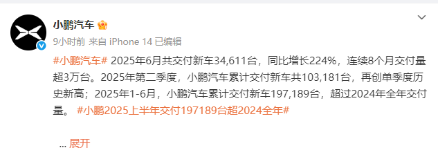 小鹏汽车发布数据显示,2025年6月共交付新车34611辆,同比增长224%,连续8个月交付量超3万辆。2025年第二季度,小鹏汽车累计交付新车共10.3万辆,再创单季度历史新高;2025年1—6月,小鹏汽车累计交付新车19.7万辆,超过2024年全年交付量。